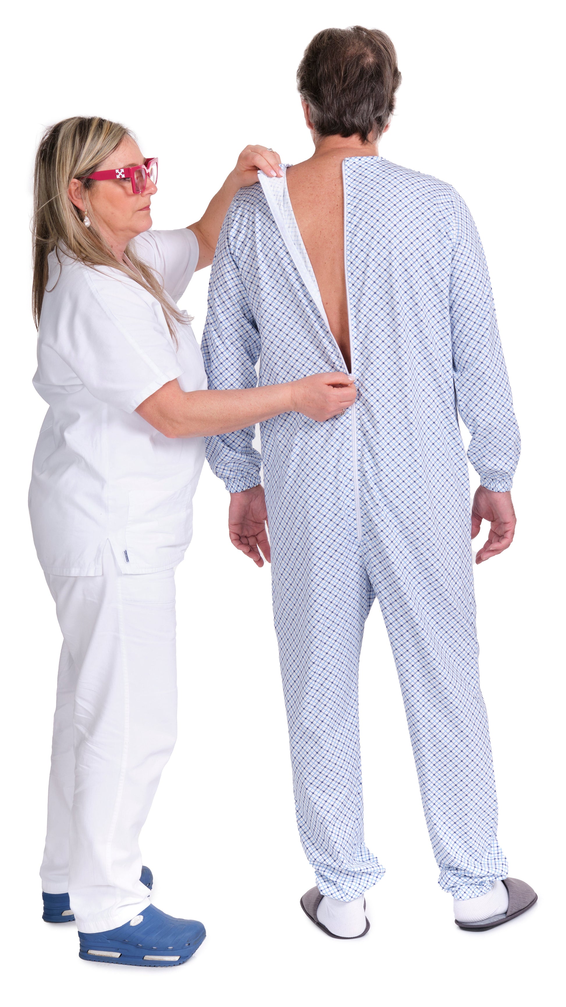 Adaptive pyjamas recommended for those who suffer from incontinence and/or discomfort with clothing due to Alzheimer's, senile dementia or mental disability.