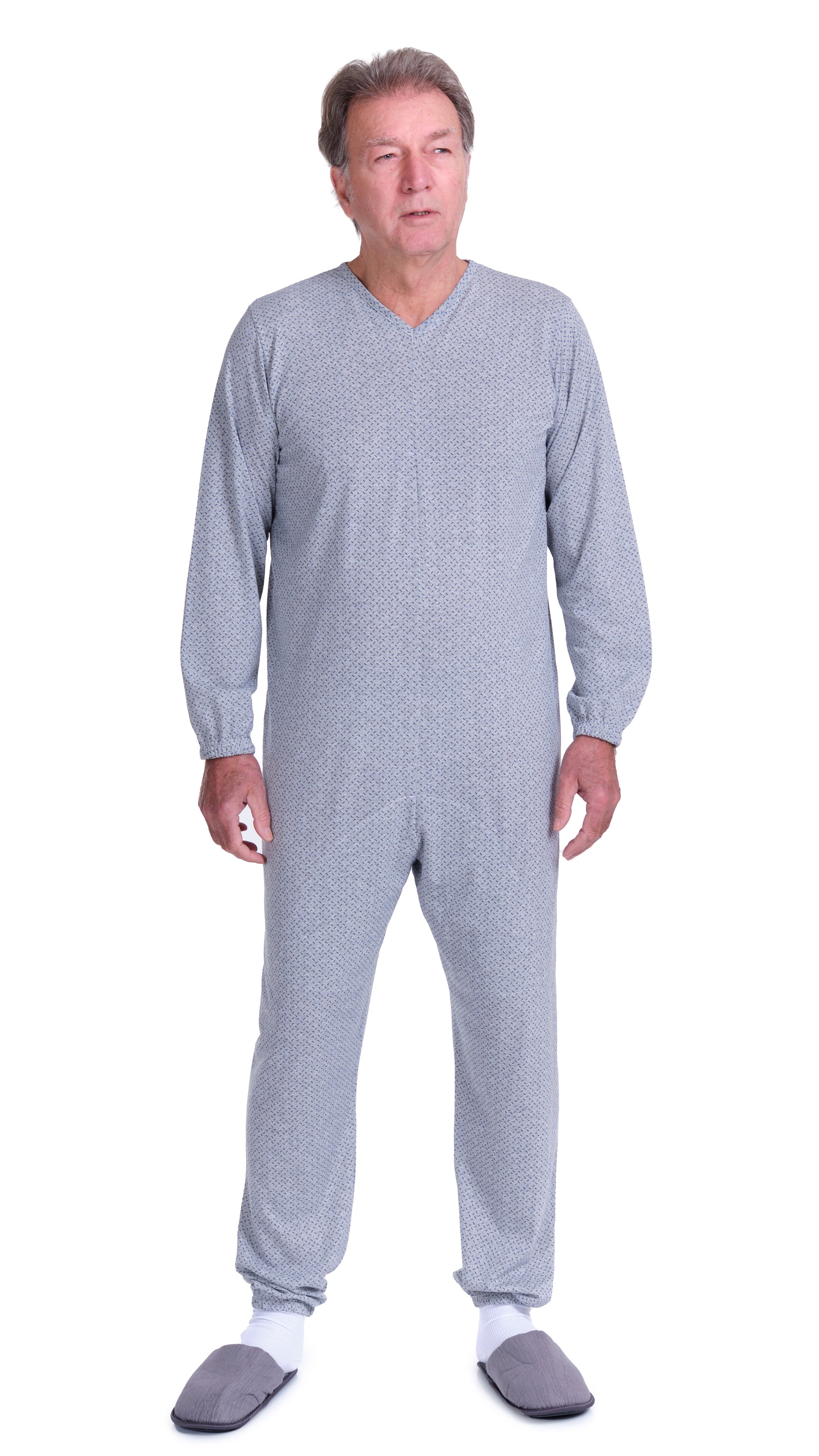 Geriatric onesie pyjamas: recommended for those with incontinence and/or intolerance to clothing due to Alzheimer's, senile dementia or mental disability.