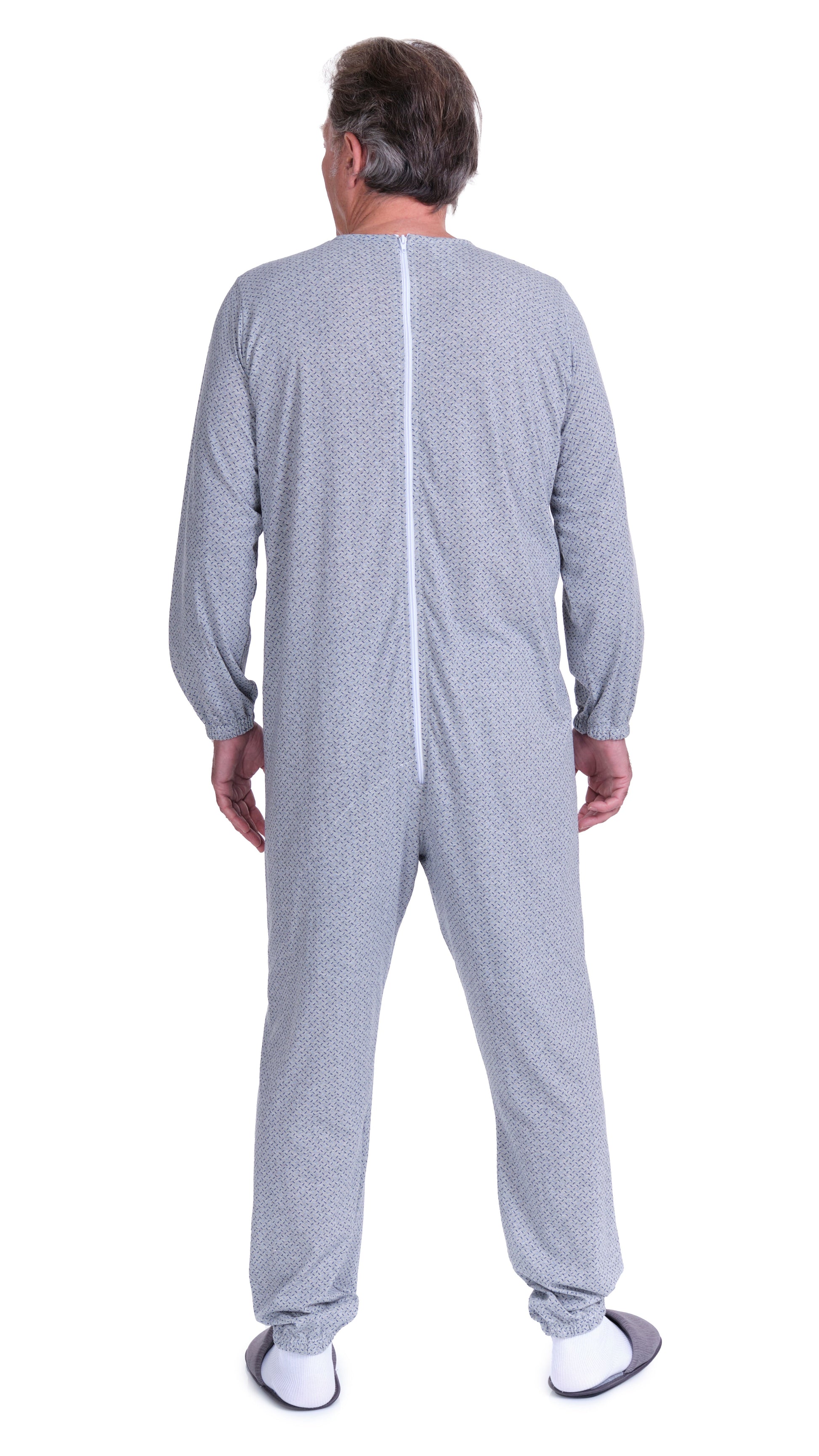 Equipped with a rear zip to facilitate closure and prevent accidental removal of the pyjamas by the patient.