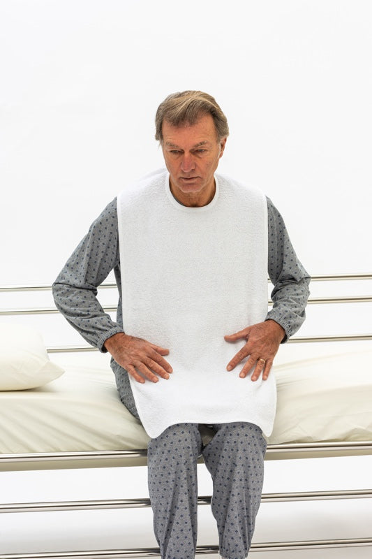 This long terry cloth bib, measuring 90 cm in length, offers extended coverage for protection during meals or care routines. Crafted from 100% cotton terry cloth, it ensures soft, absorbent comfort while being durable enough for repeated use.