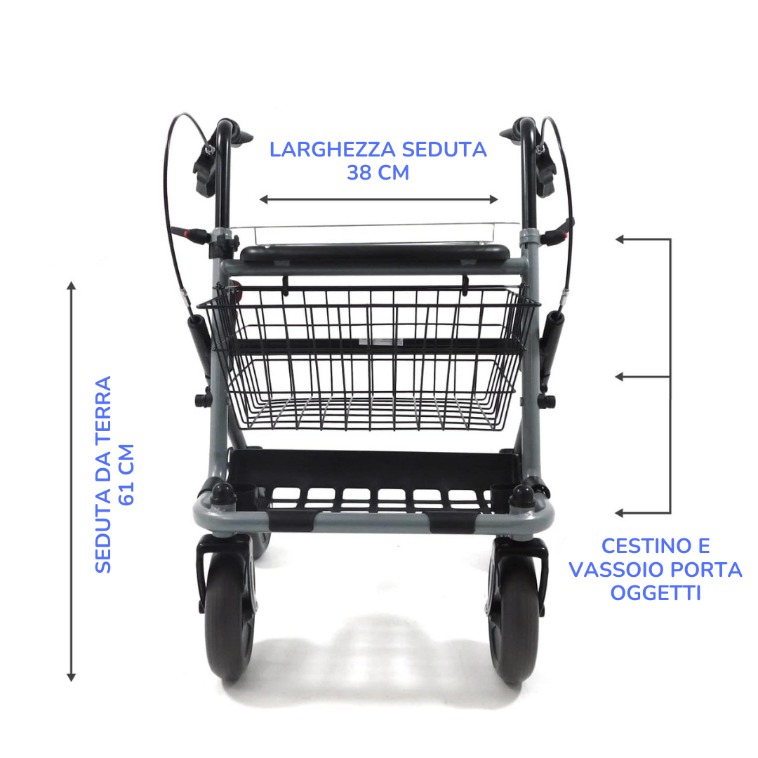Equipped with 4 wheels (including 360° swivel front wheels), parking brakes, a padded seat, two baskets, and a utility tray, it ensures maximum comfort and practicality for everyday activities indoors and outdoors.