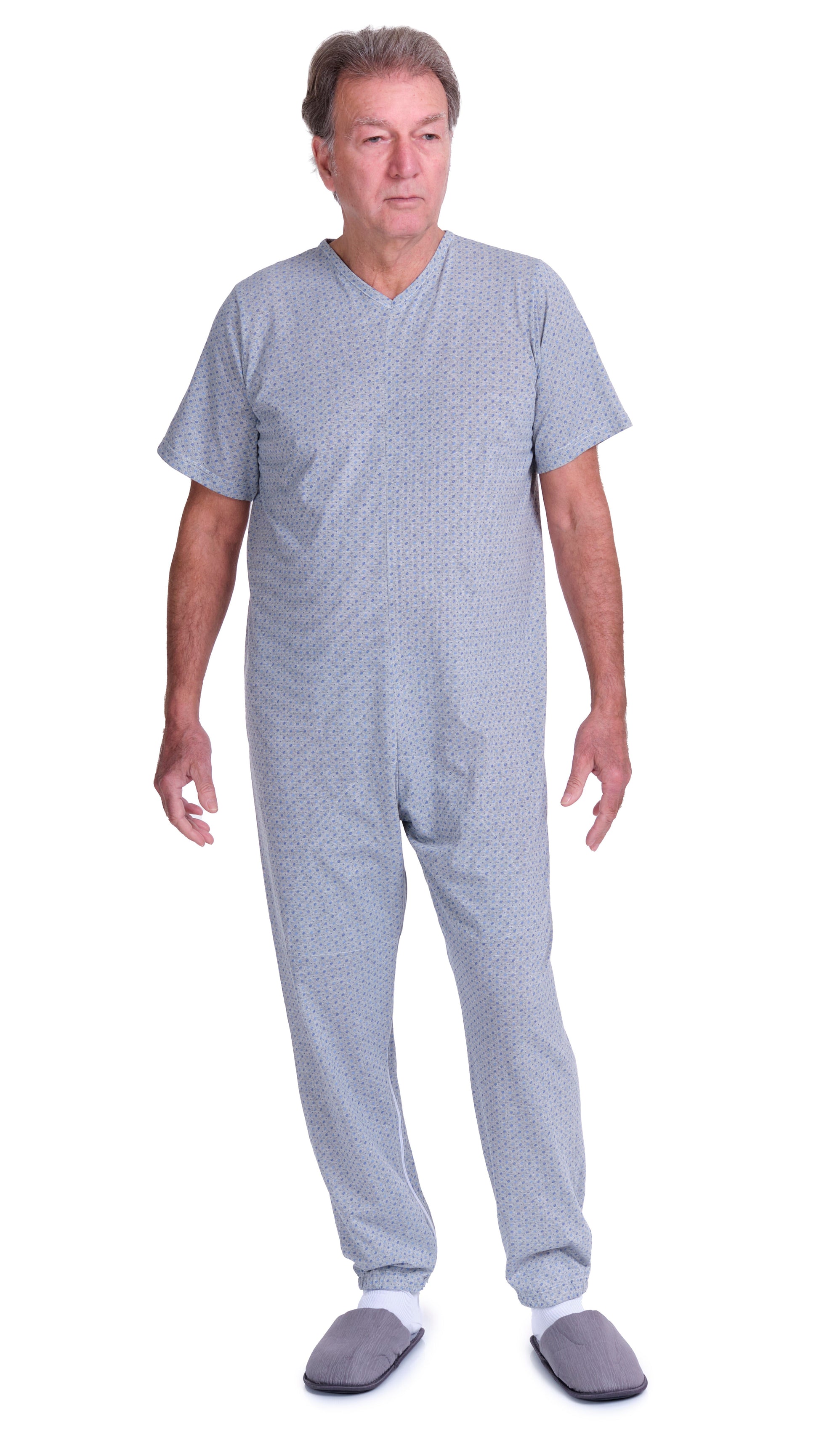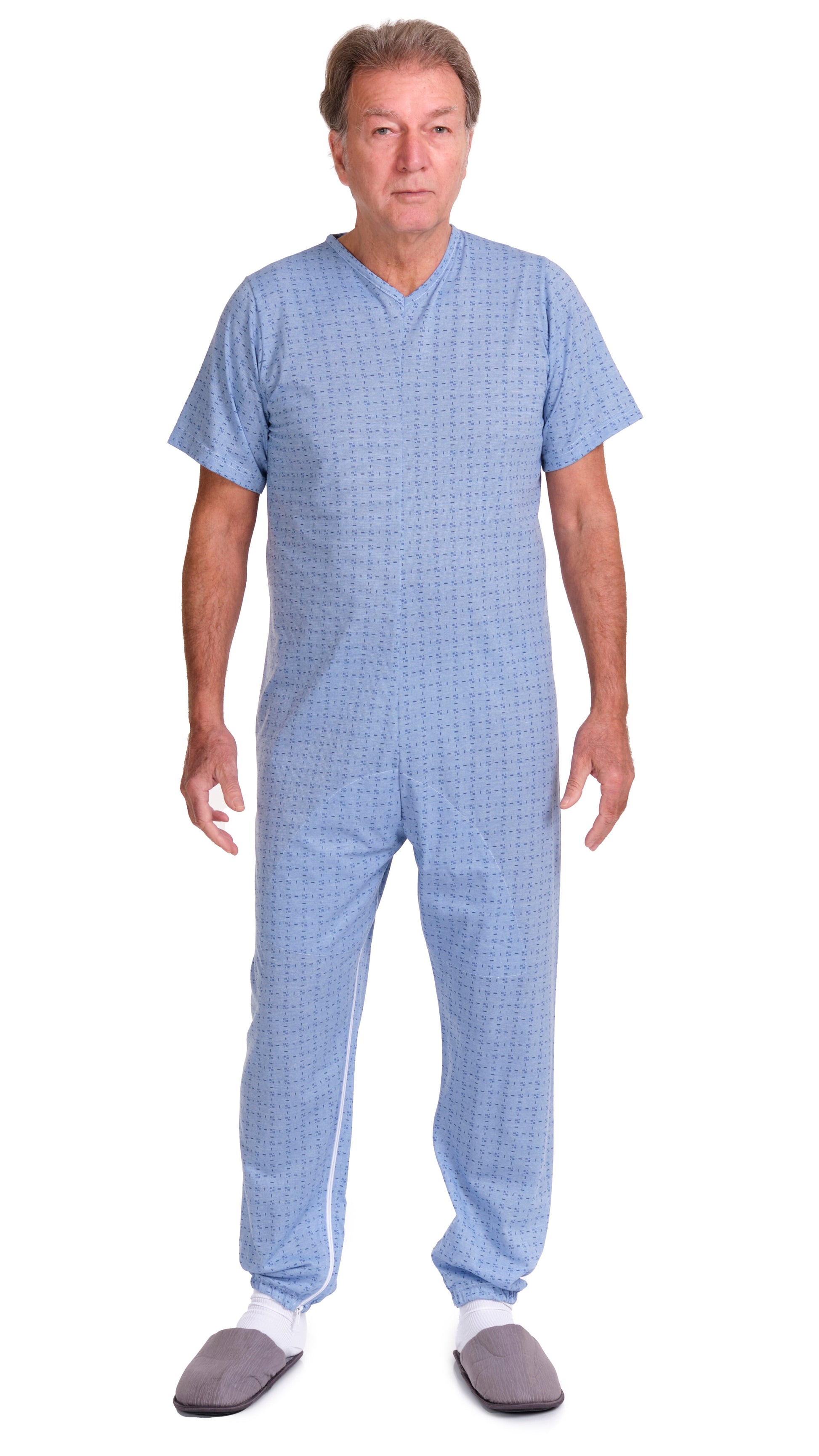 Medical pyjamas recommended for those with incontinence and/or discomfort with clothing due to Alzheimer's, senile dementia or mental disability.