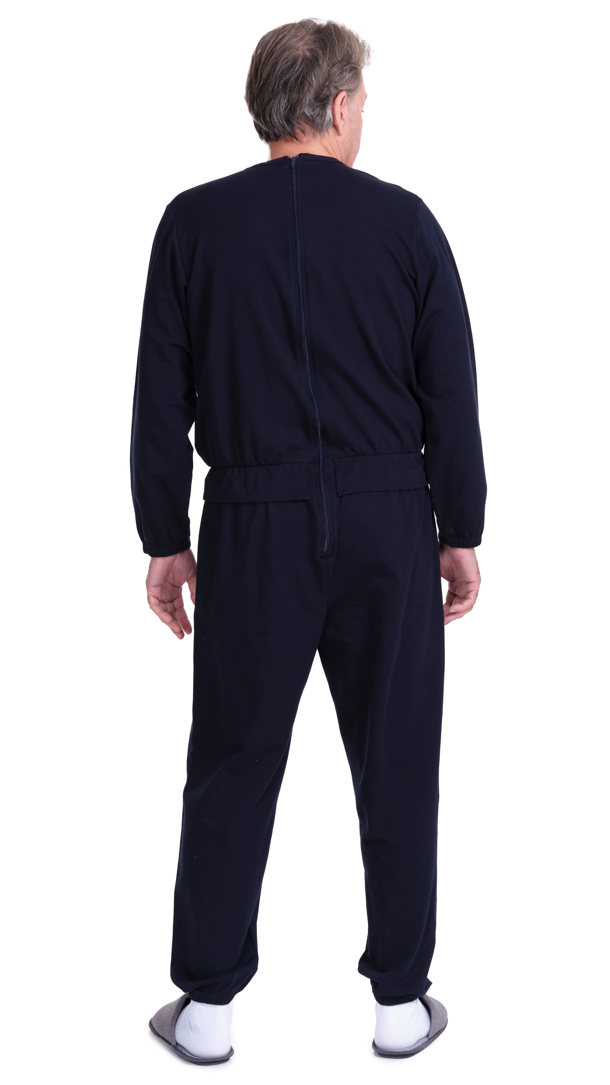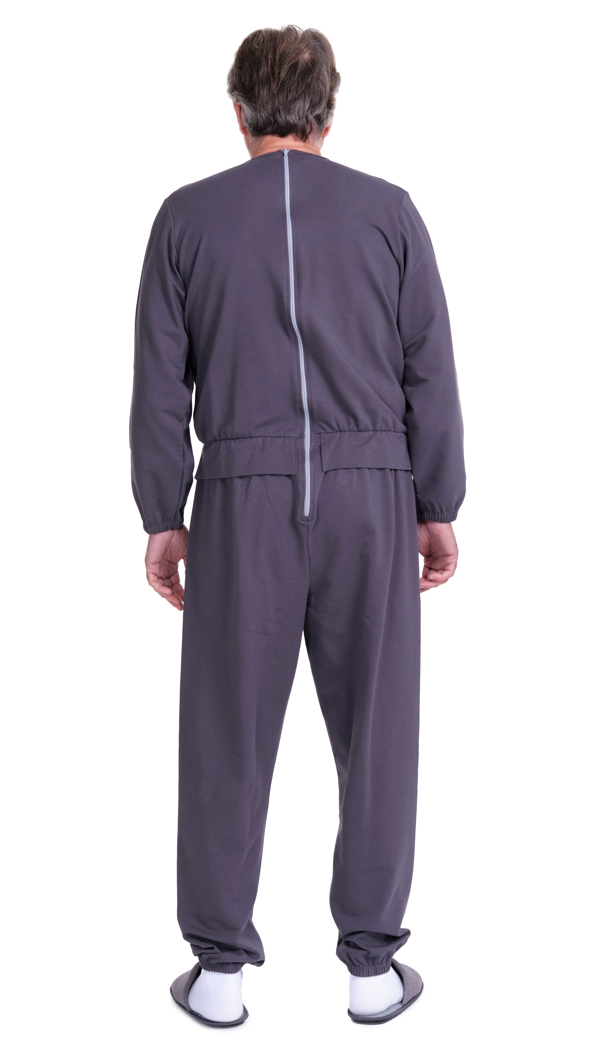 It appears to consist of two pieces: a jacket and trousers, but it is actually a single piece. The rear zip allows for easy changing of aids. The buttons and pocket are embroidered, so they are purely decorative.