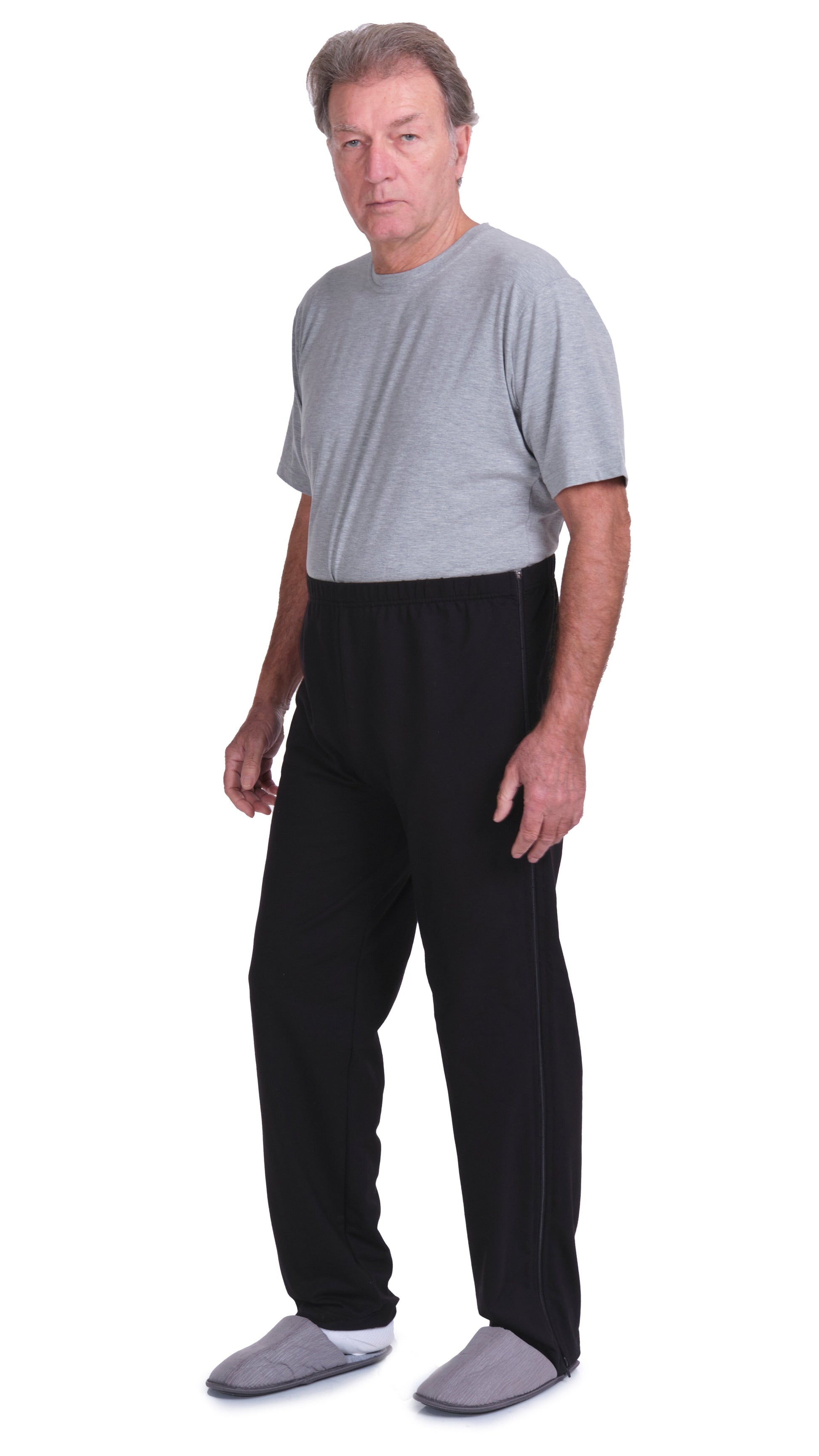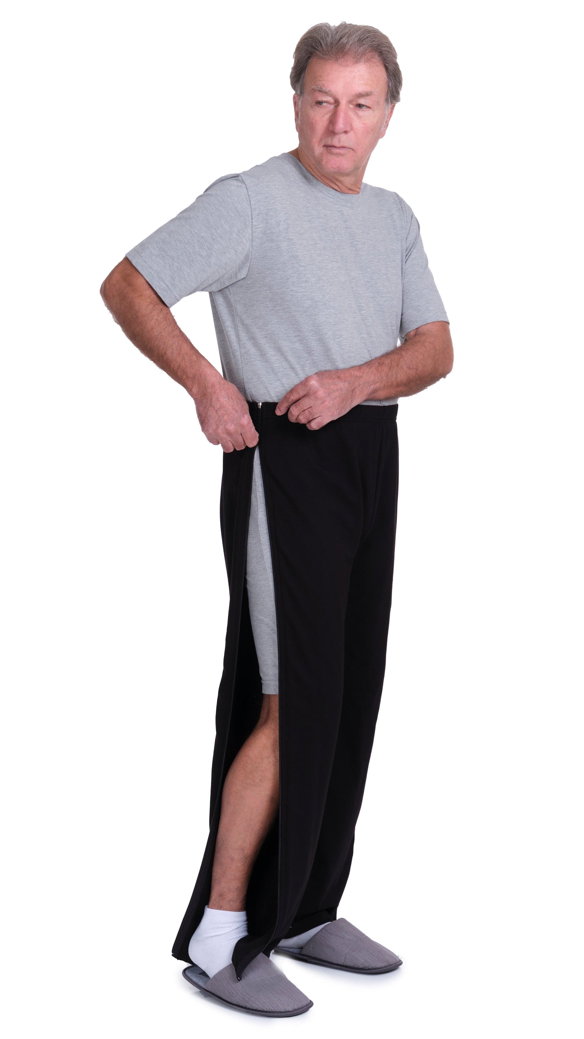 Designed specifically for post-operative rehabilitation, these trousers feature zips running from the waist to the ankle on both sides, allowing them to be fully opened for easy dressing and undressing.