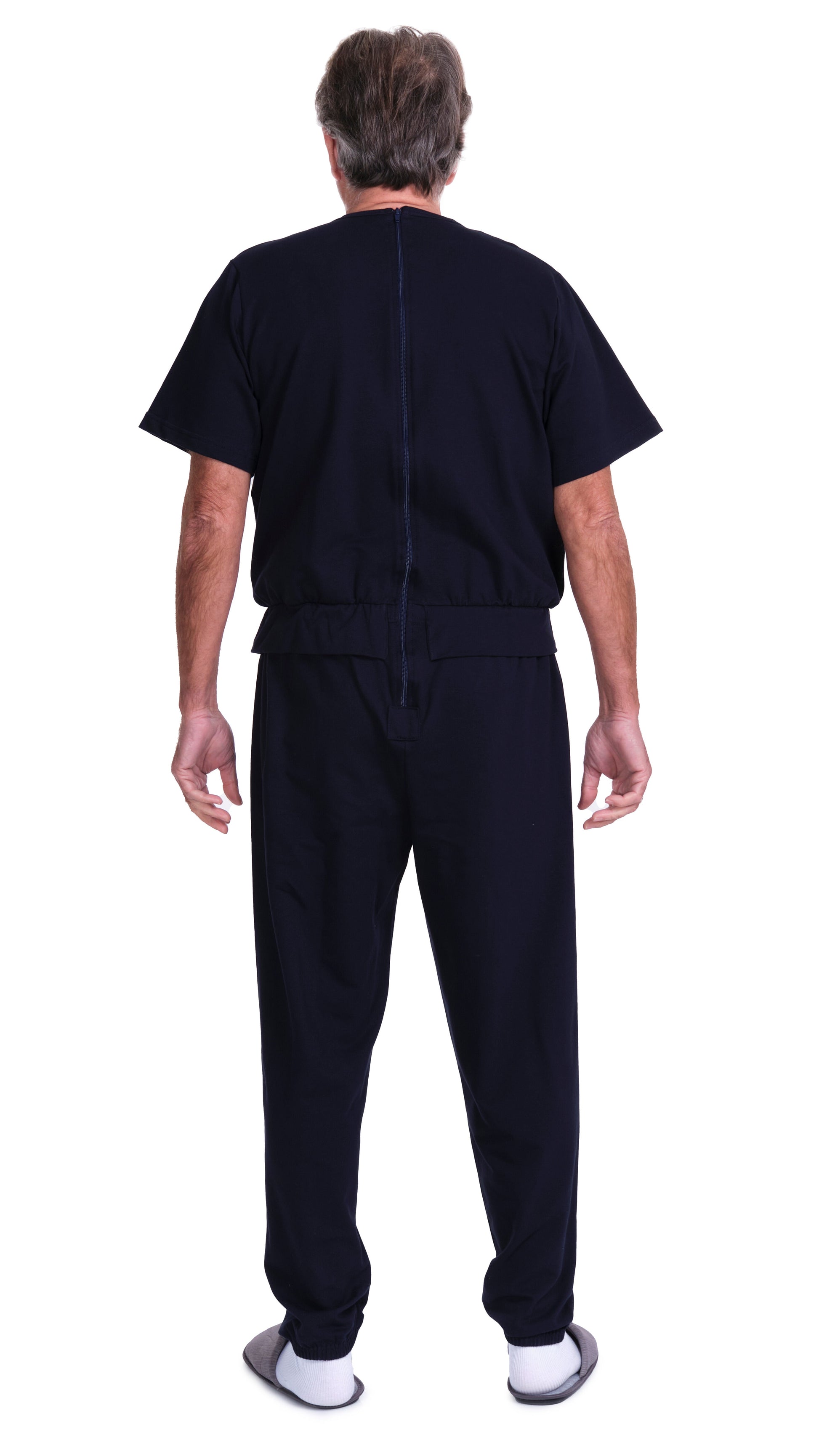 The rear zip allows for easy changing of aids. The buttons and pocket are fake to avoid posing a hazard to patients.