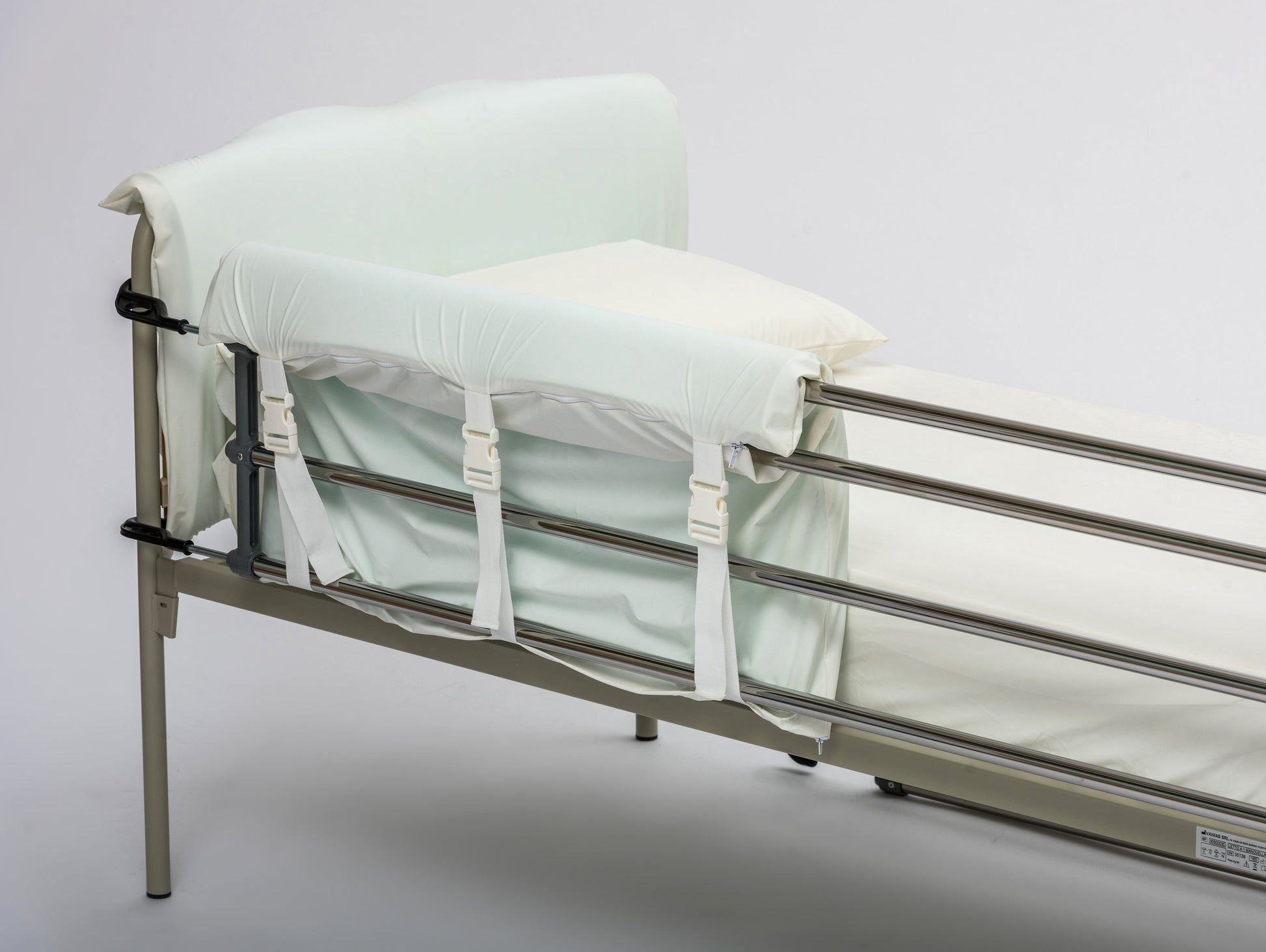 Removable, contoured bumper pad. Attaches to the side rails of the bed with straps and clips.