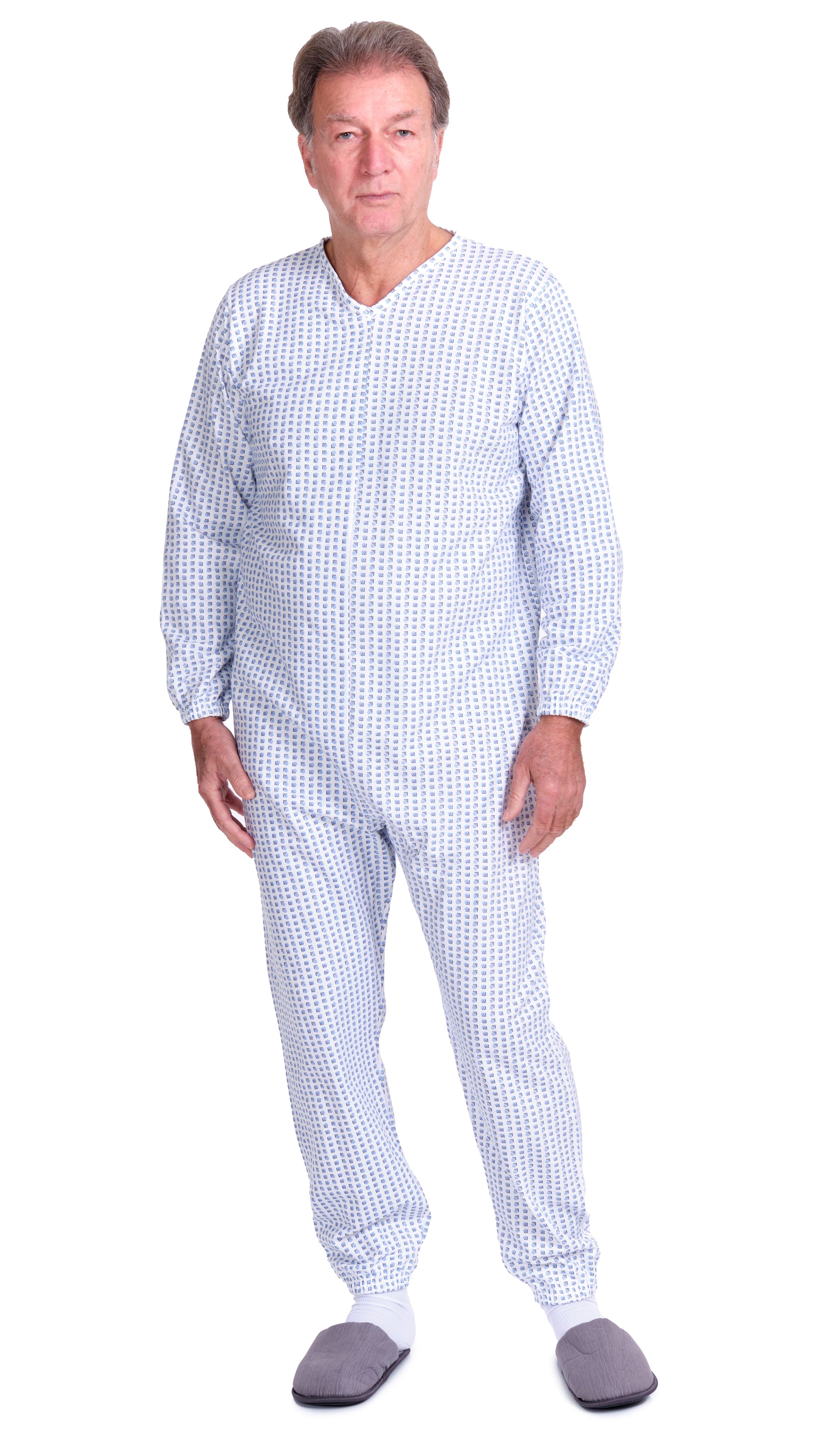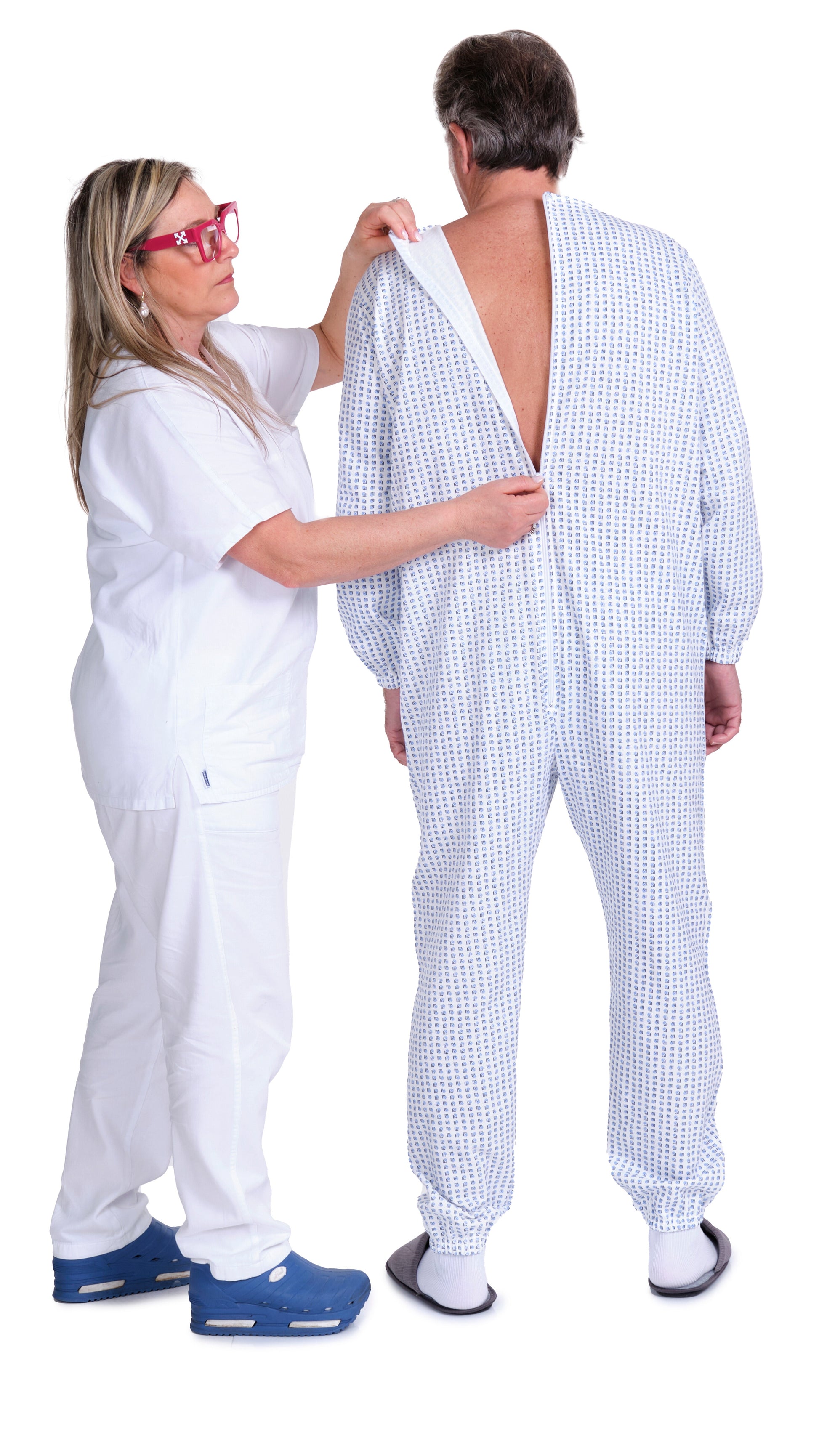 Medical pyjamas recommended for those with incontinence and/or discomfort with clothing due to Alzheimer's, senile dementia or mental disability.